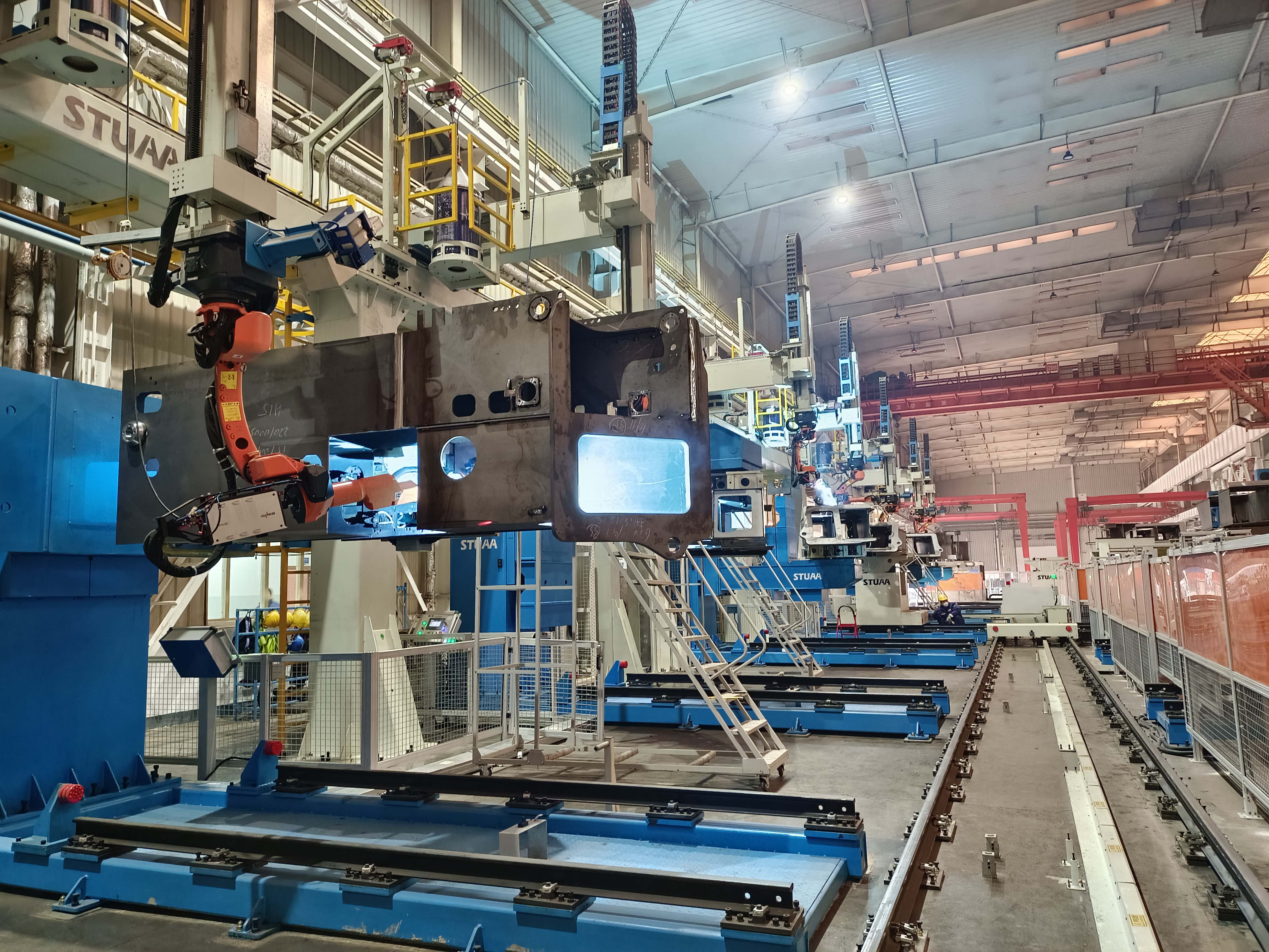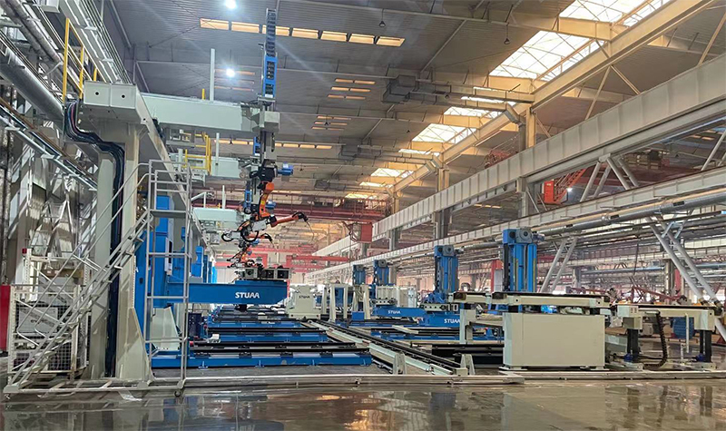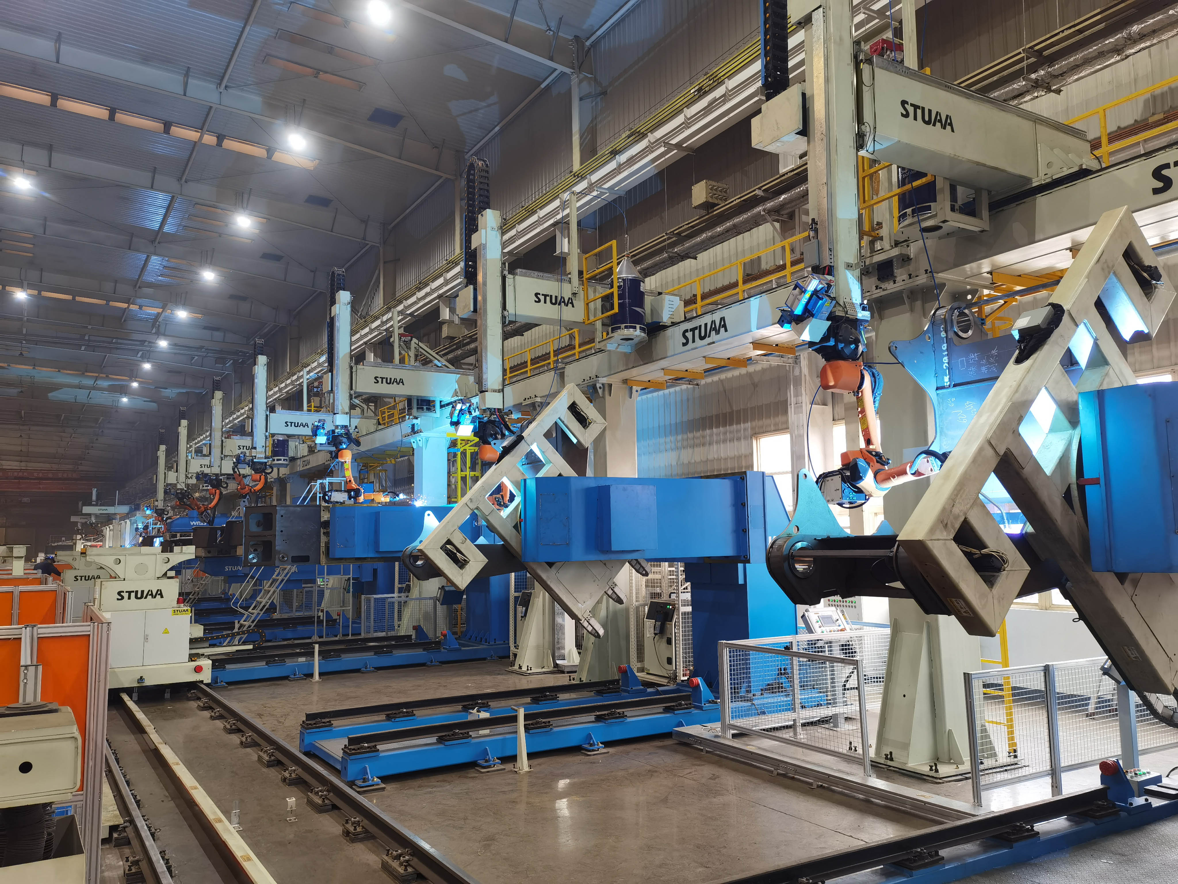 整條產(chǎn)線共有13臺(tái)機(jī)器人和2臺(tái)自動(dòng)上下料RGV,分為東區(qū)和西區(qū)。整線實(shí)現(xiàn)了RGV自動(dòng)識(shí)別指令,機(jī)器人自動(dòng)調(diào)取相應(yīng)的程序,全線可自動(dòng)識(shí)別工件,自動(dòng)夾緊,做到無(wú)人操作。東區(qū)包括圓筒組件和回轉(zhuǎn)底座總體的自動(dòng)化焊接,是整個(gè)產(chǎn)線自動(dòng)化焊達(dá)率最高的部分,可達(dá)95%。產(chǎn)線總體正反兩個(gè)面我們采用不同的自動(dòng)化設(shè)備分別實(shí)現(xiàn),有效提高自動(dòng)化焊達(dá)率。回轉(zhuǎn)底座智能焊接生產(chǎn)線是行業(yè)內(nèi)的首條,不論從自動(dòng)化水平、焊接質(zhì)量還是生產(chǎn)效率、工人勞動(dòng)強(qiáng)度等各個(gè)方面,都代表了行業(yè)最高水準(zhǔn)。